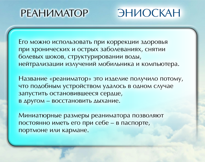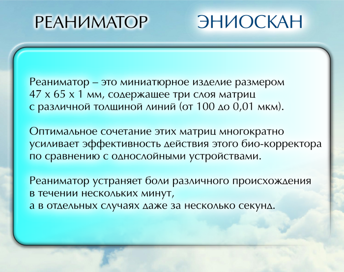 А человек является активной антенной. При расположении этих двух антенн в непосредственной близости друг от друга возникает активный колебательный контур. В результате возникающего биорезонанса происходит перестройка человеческого организма в сторону более гармоничного, здорового состояния, которое и заложено в узорчатых слоях реаниматора.